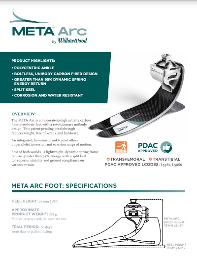 The META™ Arc is a moderate-to-high activity carbon fiber prosthetic foot with a revolutionary unibody design. This patent-pending breakthrough reduces weight, free of wraps, and hardware.